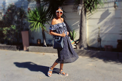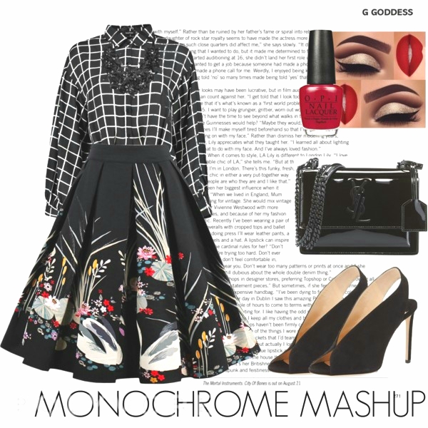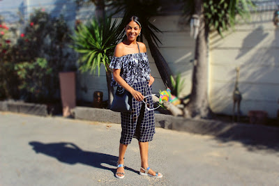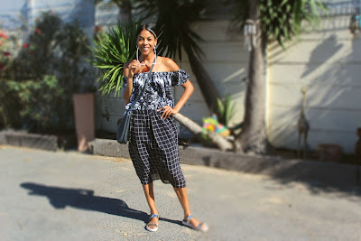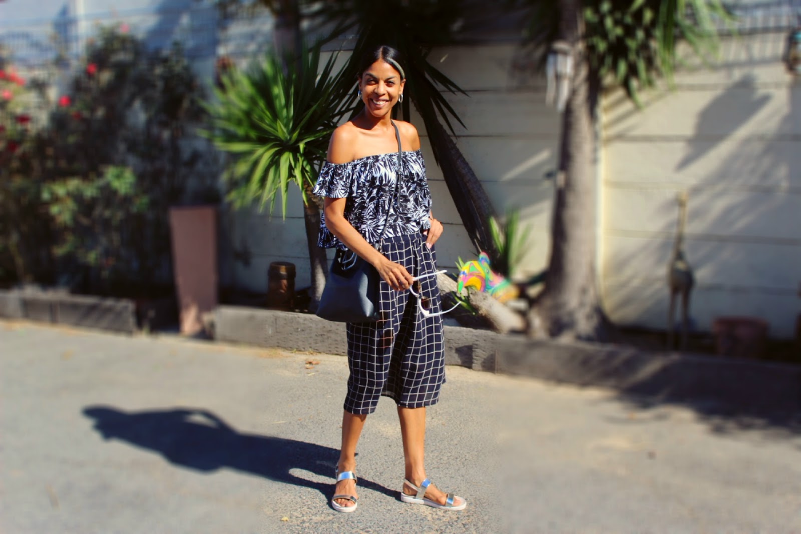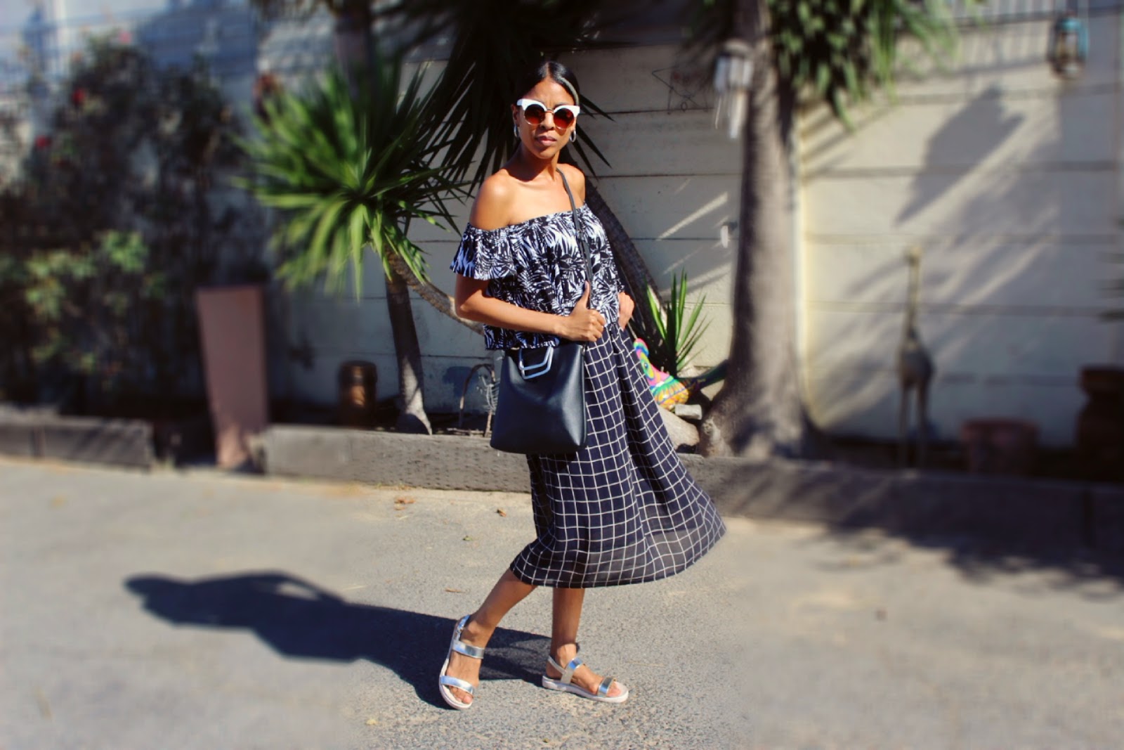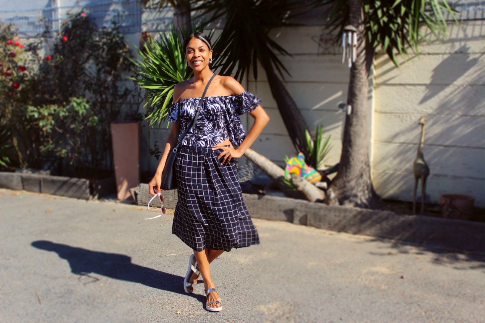 .. a black and white palm print off shoulder, teamed with a grid print skirt…